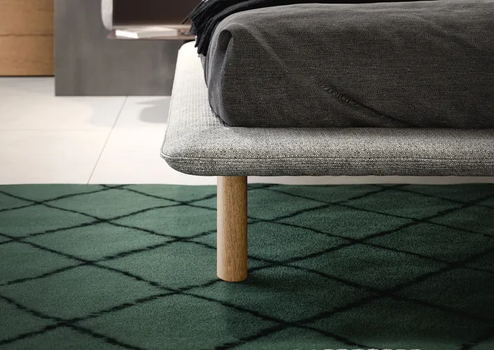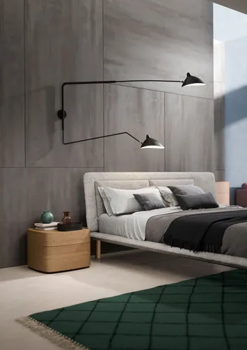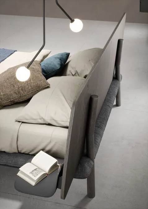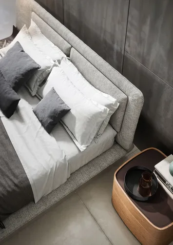 Das Bett MATISSE besitzt einen hohen Wiedererkennungswert und ist ein echter Blickfang. Das Kopfteil ist auch als gepolsterte Version erhältlich und ragt auf einer oder auf beiden Seiten über das Bett hinaus. Dieser Überstand lässt sich nutzen, um elegante Ablageflächen aus Leder zu integrieren.