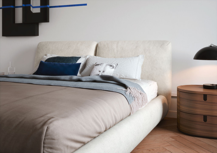 Das Bett MIDNIGHT zeichnet sich durch ein elegantes Design aus, das weiche und moderne Linien gekonnt kombiniert. Das Kopfteil, das aus zwei nebeneinander angeordneten, abgerundeten Kissen besteht, fügt sich perfekt in die ebenso gerundete, gepolsterte Bettumrandung ein und bietet ein Gefühl von Kontinuität und fließenden Linien. Das Bett MIDNIGHT ist auch in einer Version mit Staukasten und manuellem oder motorisiertem Hubmechanismus erhältlich, durch den der Federholzrahmen in eine erhöhte und damit bequemere Position gebracht werden kann.