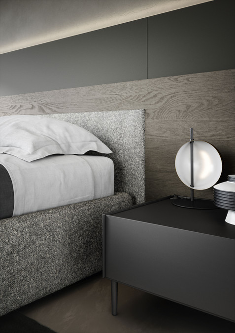 Das wandmontierte Design-Kopfteil TIME besteht aus zwei sich überlappenden Paneelen mit unterschiedlicher Höhe. Hierbei können verschiedene Ausführungen miteinander kombiniert werden, darunter auch abnehmbare Bezüge aus Stoff oder Textilleder.