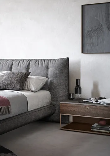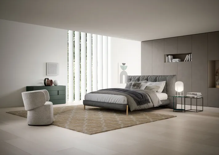 Die Weichheit des gepolsterten Kopfteils wird durch die horizontalen Nähte TUFTÉ nicht nur Hochwertigkeit verleihen, sondern auch zu seinem charakteristischen Erscheinungsbild beitragen. Die Bettumrandung, minimal und funktional, ruht auf Holzbeinen, welche den Eindruck vermitteln, das Bett würde im Raum schweben.