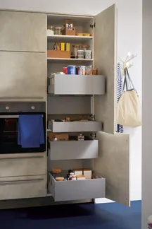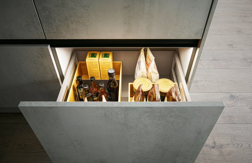 Die Weinbar in der Küche, die Kochinsel für genussreiches Zubereiten: Was will man mehr! Da wäre noch die perfekte Innenschubeinteilung der Auszüge oder ein praktischer Apothekerschrank für alles, was man schnell im Zugriff haben möchte. Apropos Griffe – da hat sich PAUL LEVÍN etwas ganz Feines ausgedacht: horizontale und vertikale Griffleisten in Onyxschwarz, die optimal den Look der Küche unterstützen.