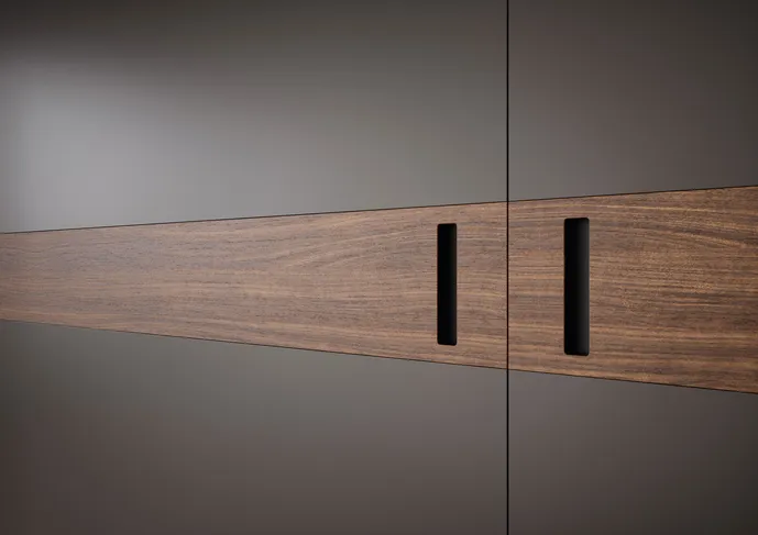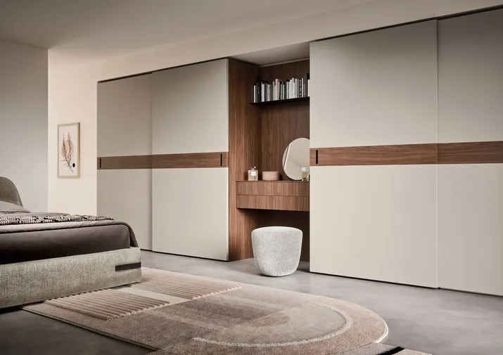 Schlichtheit und Eleganz charakterisierten den Schrank mit flächenbündigen Schiebetüren CLASS und farblich abgestimmten Griffen. CLASS kann das Paneel in allen matten, oxidierten oder glänzenden Lackfarben gestaltet werden. Der mittig positionierte Einsatz wird auch in noce canaletto Version angeboten. Der Schrank CLASS kann als Einbaulösung, wandstehend oder auch in Kombination mit einem Eckmodul mit Flügeltür geplant werden.