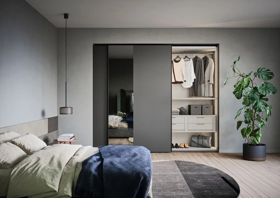 Moderne Linienführung beim Schrank mit Schiebetüren OFFSET. Das Paneel mit Einsatz wird in allen matten, oxidierten Lackfarben sowie in melaminbeschichtet-gemasert und Super-matt angeboten. Einsatz in Spiegelausführung und in lackiertem Glas.