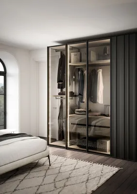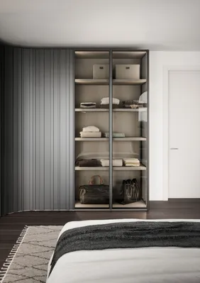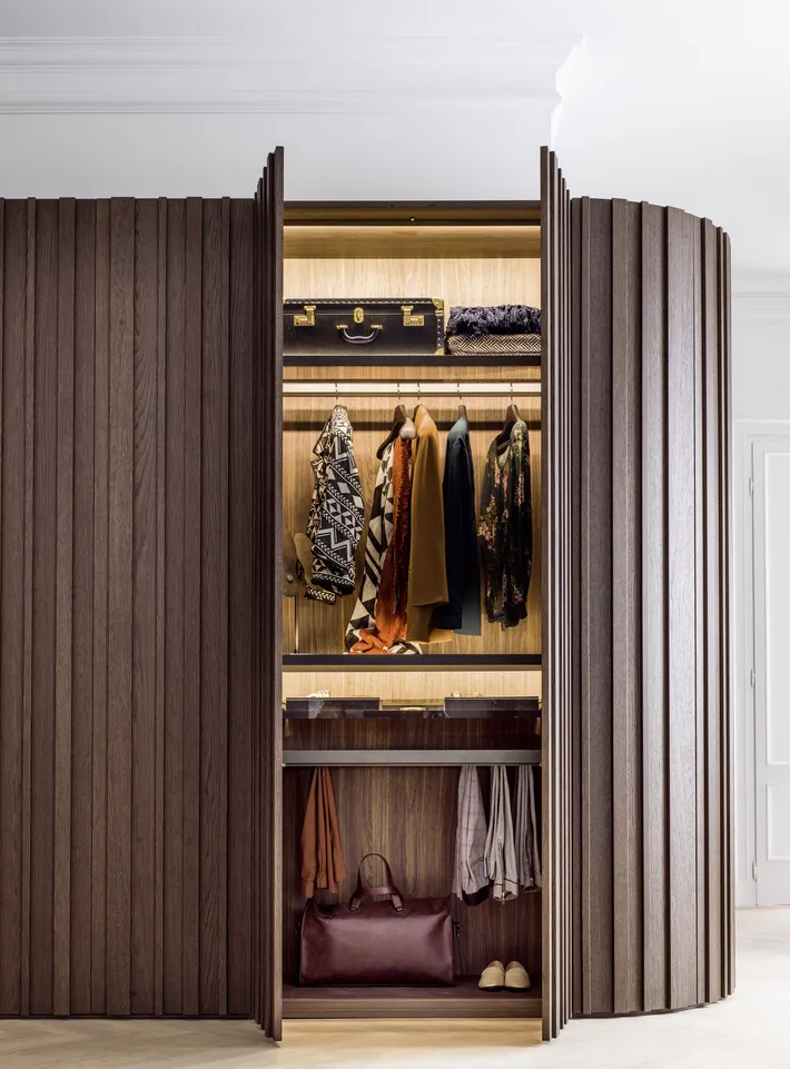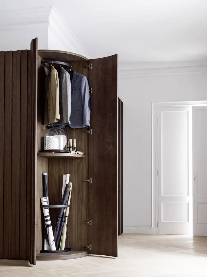 Die Türen mit senkrechten Streifen, die Grundelemente mit geschwungener Linienführung und die Tip-on-Öffnung sind nur einige der Elemente, welche die Einzigartigkeit des Schrankes mit Flügeltüren STAVE ausmachen. Der Tip-on-Beschlag macht die Tür funktional, hochwertig und aus ästhetischer Sicht makellos. So wirkt der grifflose Schrank wie eine Wandtäfelung. STAVE lässt sich aus diesem Grund hervorragend als Trennwand zwischen zwei Räumen einsetzen.