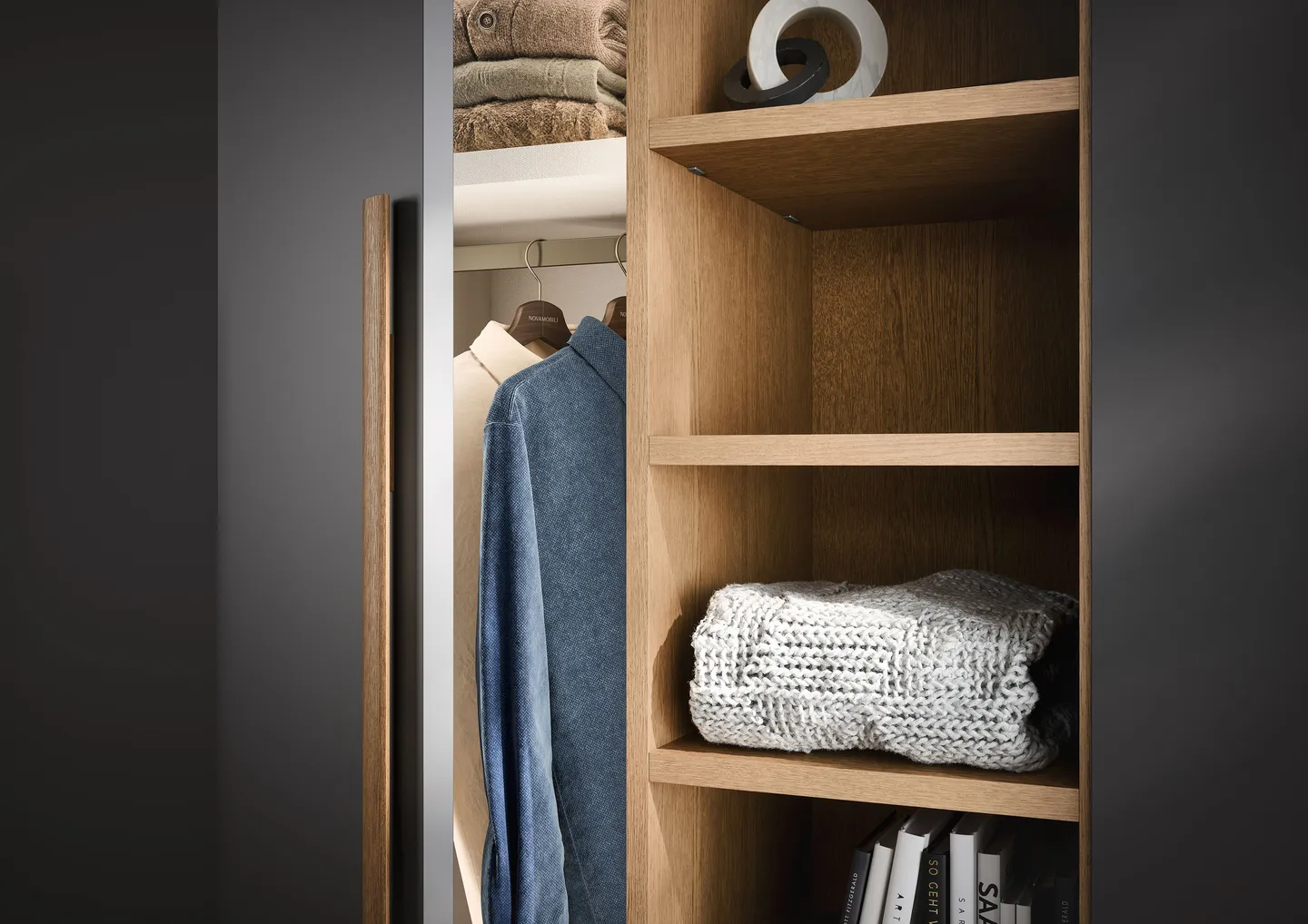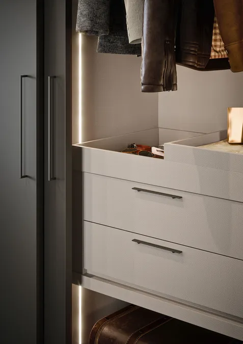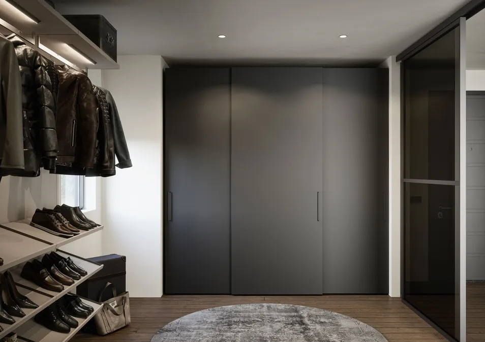 Der Flügeltürenschrank THICK zeichnet sich neben seinem modernen, geradlinigen Design besonders durch seine massiven, 3 cm starken Türen aus. Diese können zusätzlich mit einer großen Auswahl an Griffen individuell gestaltet werden. Er ist in matten und oxidierten Lackausführungen erhältlich. Der Schrank THICK kann als Einbau- oder Wandschrank oder auch als Ecklösung geplant werden. Wie alle Flügeltürenschränke kann auch er mit einer Glasseitenwand abschließen und im Innenraum mit einer Trennwand mit Metallrahmen sowie mit einer LED-Beleuchtung ausgestattet werden.