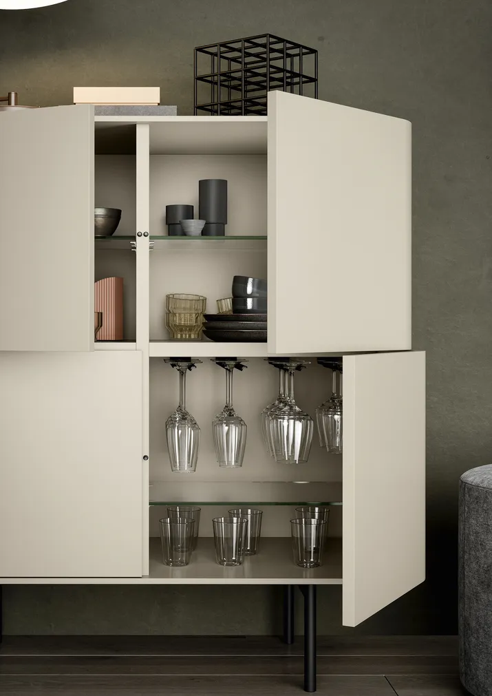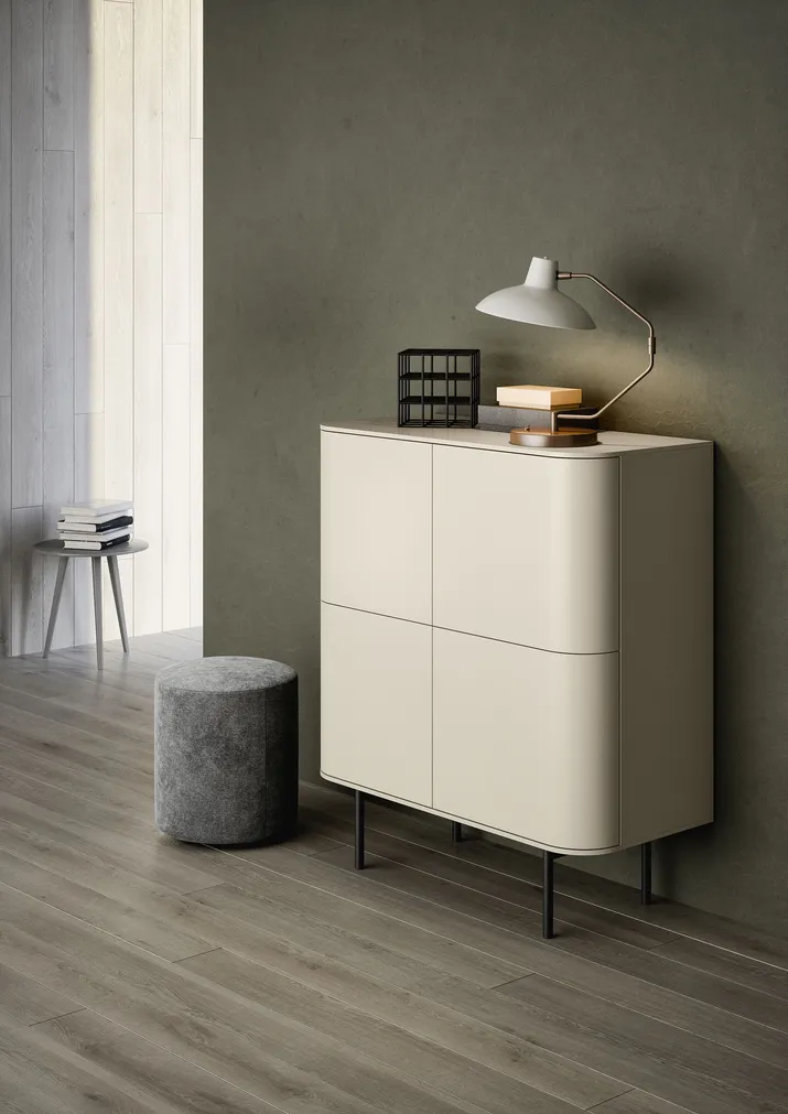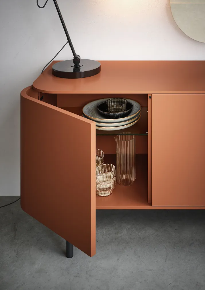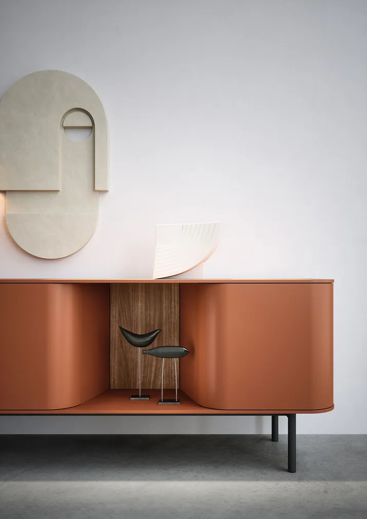 Die geometrische Form des Sideboards FJORD verschmilzt mit dem elegant geschwungenen Profil der bogenförmig gestalteten Türen. Ein raffiniertes, trendig-modernes Möbelstück, welches mit der Formensprache der 60iger Jahre spielt und auf diese Weise die Einrichtung geschickt vervollständigt. Es lässt sich individuell gestalten und wird in verschiedenen Varianten angeboten, auch mit offenem Fach zwischen den Türen.