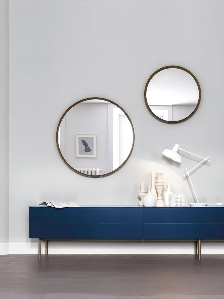 DEEP ist ein Spiegel mit kreisrunder Form, der in zwei Varianten, in einer kleinen und einer großen Version, angeboten wird. Der Rahmen, auch mit integrierter Beleuchtung, ist in allen matten, oxidierten und metal Lackfarben des Katalogs erhältlich. So lässt er sich perfekt auf die Einrichtung im Eingangs- oder auch Wohn- oder Schlafbereich abstimmen.