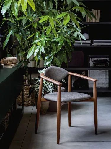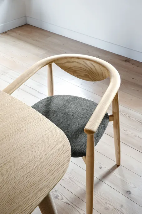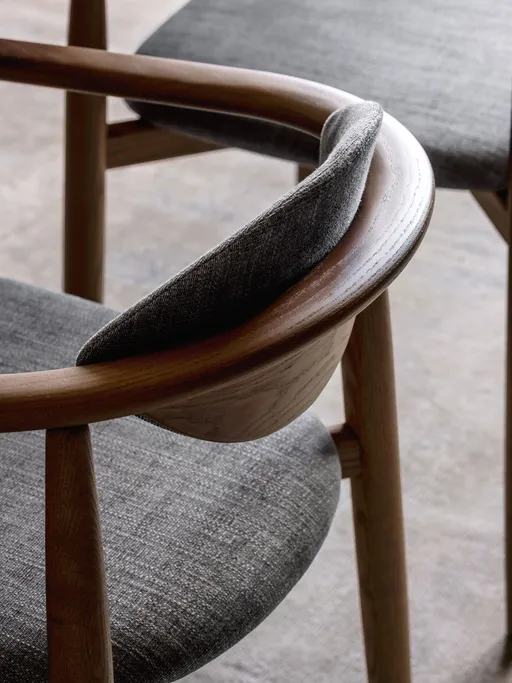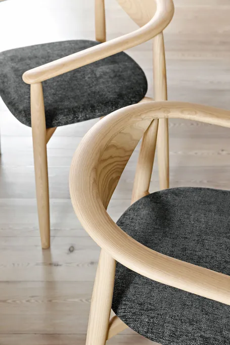 Jedes Holzelement wird per Hand vollendet und die Sitzfläche kann mit Stoff bezogen oder der Tradition entsprechend mit Strohgeflecht versehen werden. Auch mit gepolsterter Lehne.