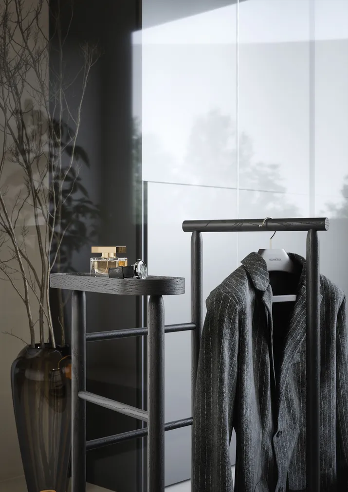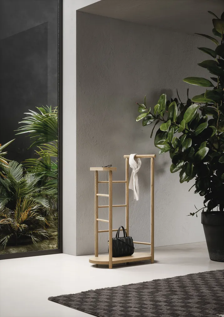 Der Herrendiener JUPITER ist auch ohne hängende Kleidungsstücke ein echter Blickfang. Er bietet dank seiner praktischen Ablage und der Kleiderstange eine elegante und funktionelle Lösung für eine optimale Raumorganisation. Er ist in den Eichenausführungen Rovere carbone und Rovere chiaro erhältlich.