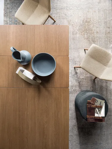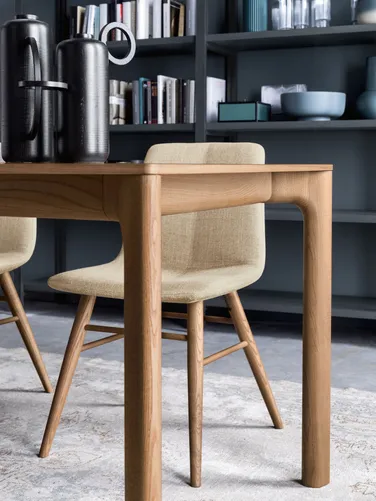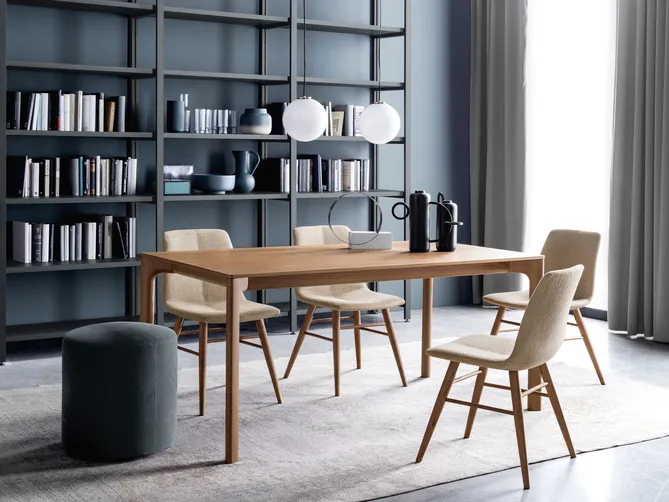 Der Tisch LEVEL zeichnet sich durch ein Tischgestell mit weicher Linienführung aus, auf dem eine schmale Tischplatte mit gerundeten Ecken ruht. Er lässt sich bis auf eine Länge von zwei Metern ausziehen und bietet auf diese Weise Platz für 10 Personen. Die Einfachheit der Formen harmoniert perfekt mit der Wärme des Holzes. Dem persönlichen Geschmack entsprechend können Sie dabei aus verschiedenen Holzarten wählen.