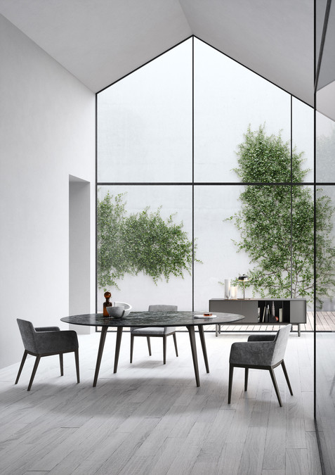REA ist das perfekte Gleichgewicht zwischen modernem, funktionalem Design und einer vom Minimalismus inspirierten Formensprache. Die leicht schräg stehenden und sich nach unten verjüngenden Beine verleihen ihm Leichtigkeit und eine auf das Essentielle beschränkte Eleganz. Die Tischplatte kann für ein einheitliches Bild in der gleichen Ausführung wie die Tischbeine in Eiche, in der Ausführung Rovere, oder in der Nussbaumvariante Noce Canaletto gestaltet werden. Alternativ können mit matten oder oxidierten Lackausführungen sowie der Wahl von Lehm oder Light Stone als Ausführung interessante Kontraste erzeugt werden.