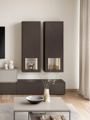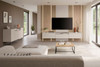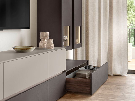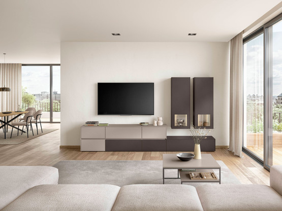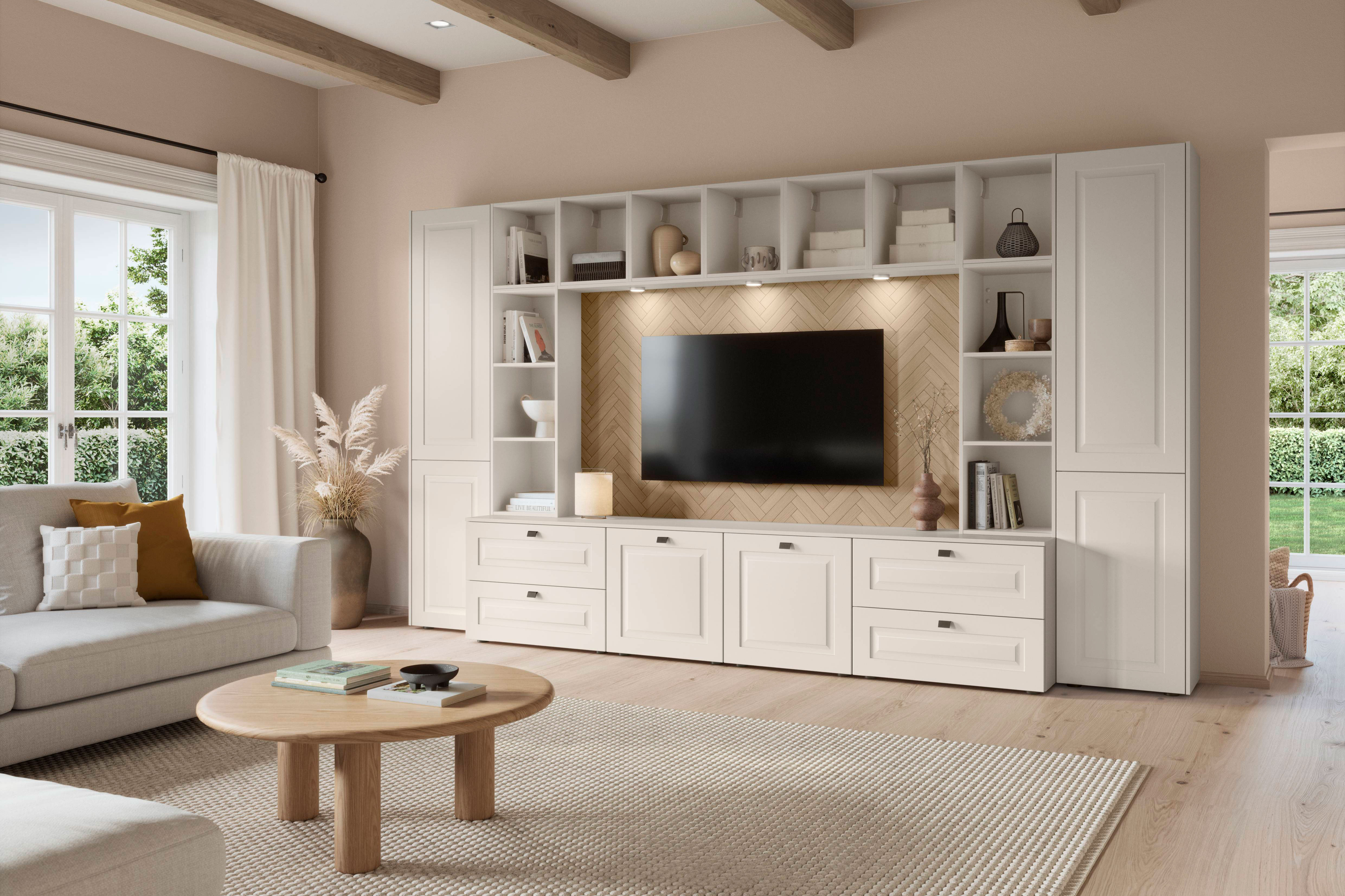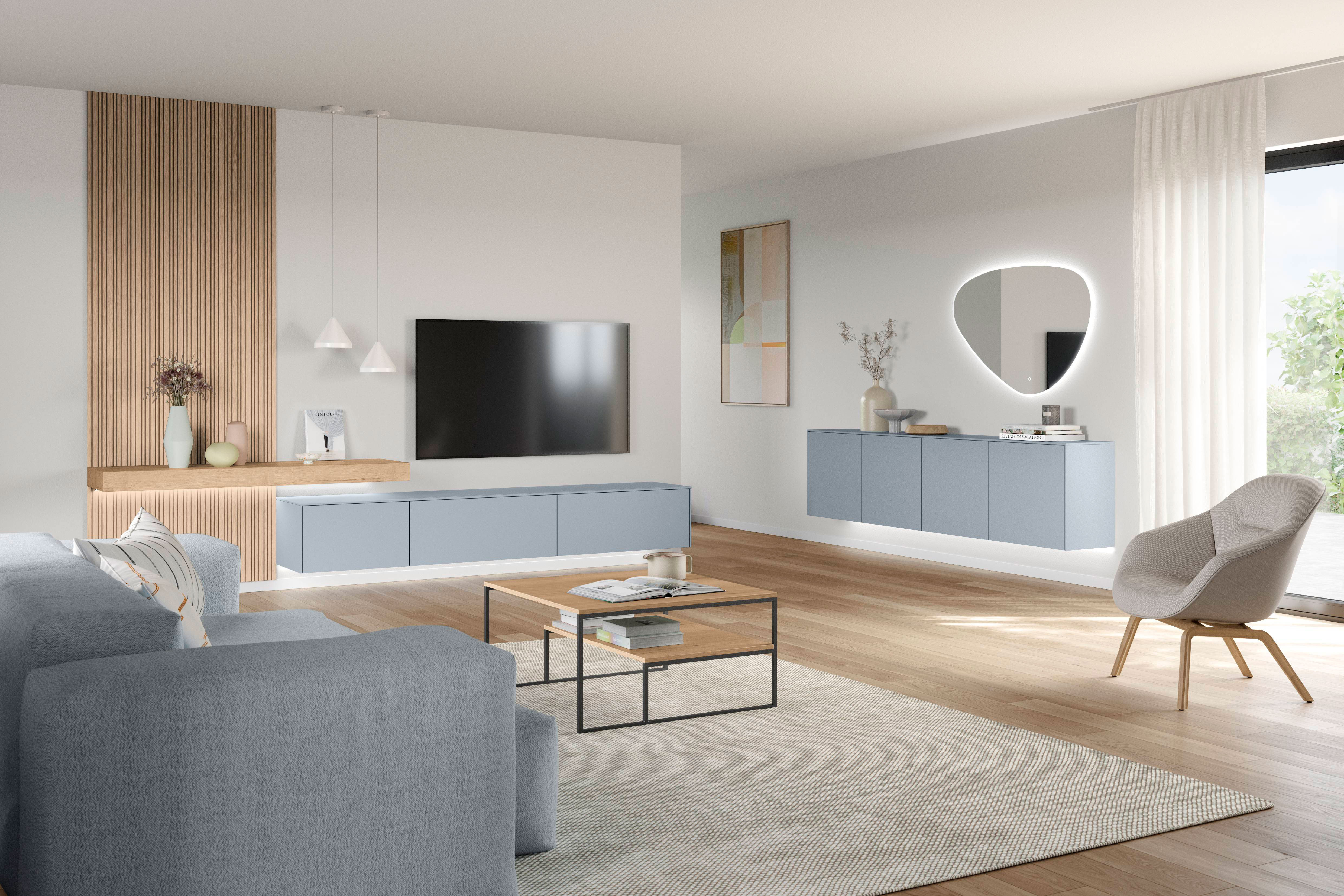 Hier zieht sanfte Behaglichkeit in das Zuhause: mit dezent strukturierten Oberflächen , die sich Ton-in-Ton mit den Wänden und Möbeln verbinden. Leichtigkeit bringen das wandmontierte Lowboard sowie Sideboard und Couchtisch mit den eleganten Kufengestellen in den Wohnraum, die die Möbel schwebend anmuten lassen.